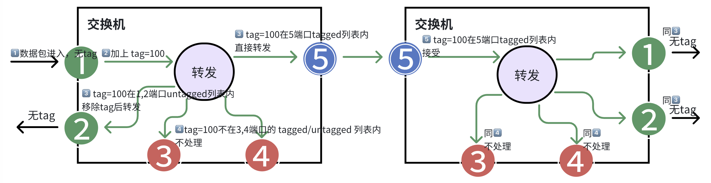 比如:从路由器1进入交换机1口的数据包没有tag,那么交换机会给数据包打上端口1的pvid (tag=100) 然后转发, 对于当前交换机的端口2: tag=100 在自己的 untagged 列表里,所以移除 tag 后转发。 对于当前交换机的端口3: tag=100 不在自己的 tagged/untagged 列表里,所以不处理。 对于当前交换机的端口5: tag=100 不在自己的 tagged 列表里,所以直接转发。 对于另一个交换机的端口5: tag=100 在自己的 tagged 列表里,所以接受。