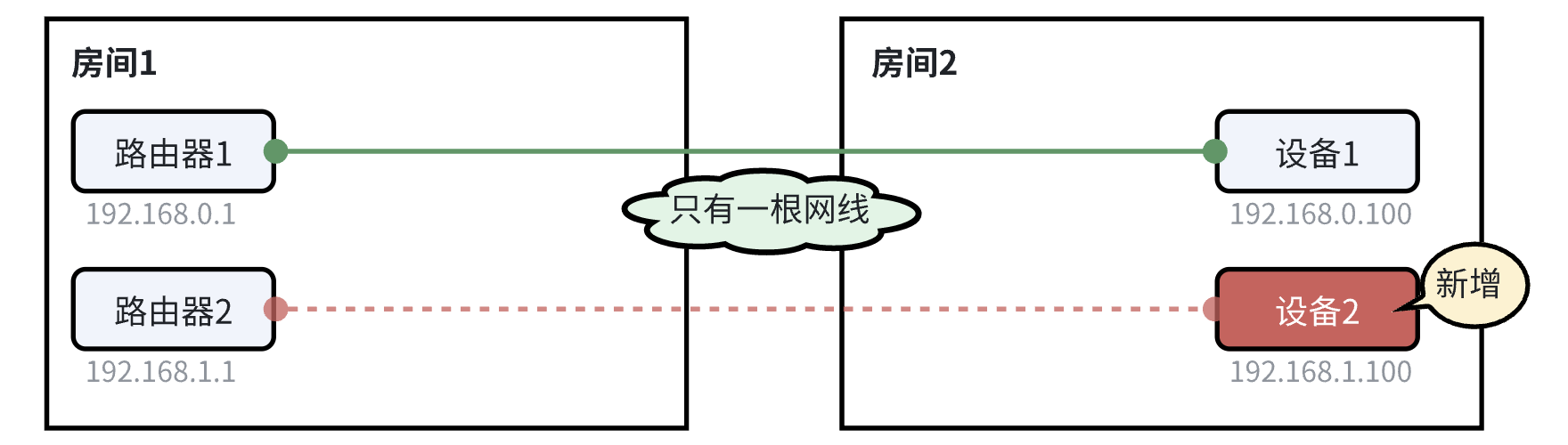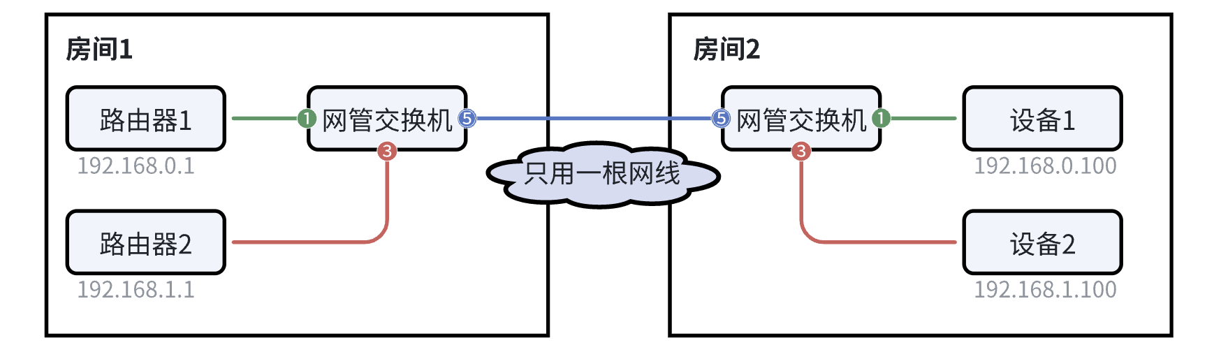 以前就知道 vlan 这个概念(确切地讲是 802.1q vlan)但是一直没有使用场景。最近需要用到,就试了下。具体场景就是在不同房间复用同一根网线划分不同子网。